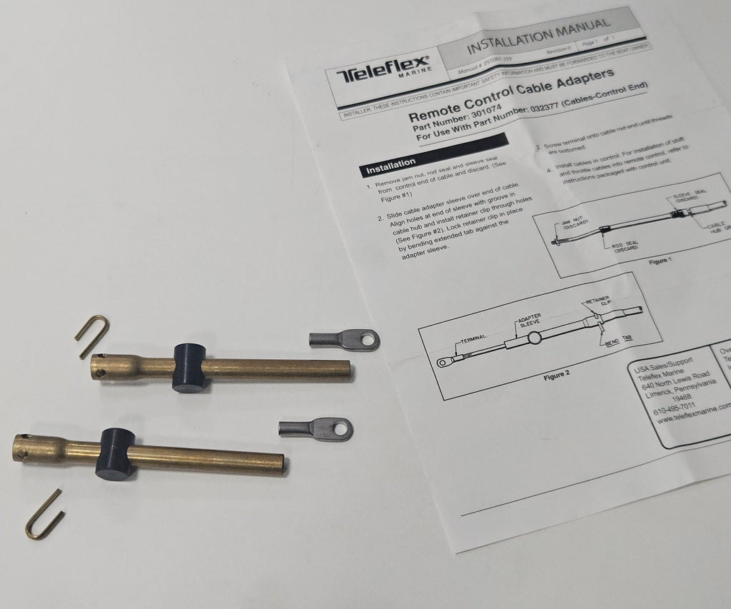 Adapts CC230, CC330, CC332, CX632 and CCX633 throttle and shift cables to suit Mercury® /Mariner® control box used with Mariner® 1992 and earlier, 40HP and below, outboards. Two brass sleeves and 2 eye ends per kit.
